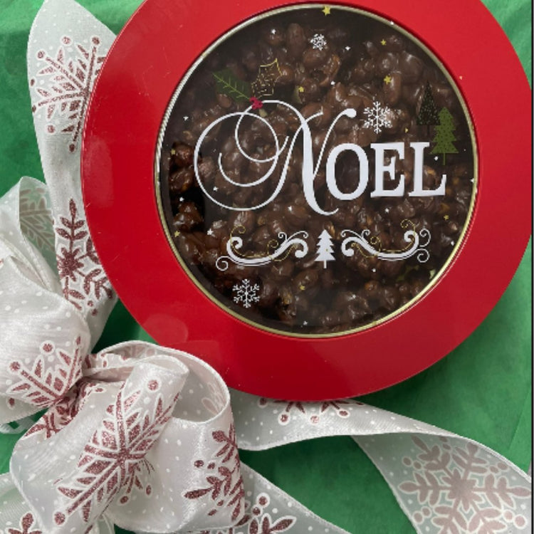 CHOCOLATE CLUSTERS IN CLEAR CHRISTSMAS CONTAINER